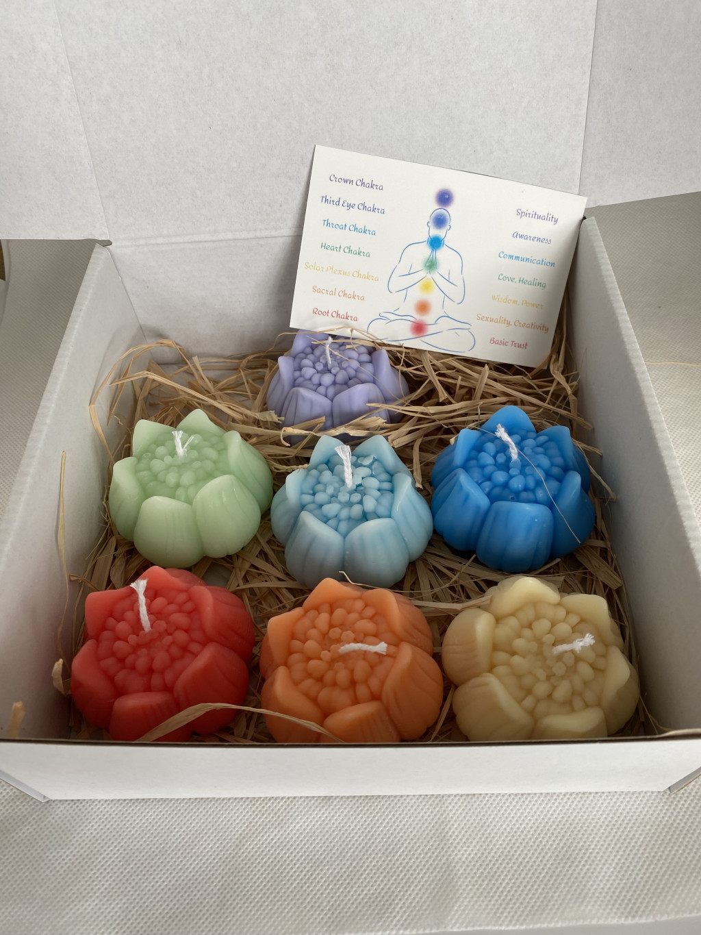 - 7 db Prémium Szójaviasz Gyertya: Minden gyertya a hozzá tartozó csakra színében pompázik, finom, aromaterápiás illóolajokkal átitatva (pl. levendula, szantálfa, citrusok).
